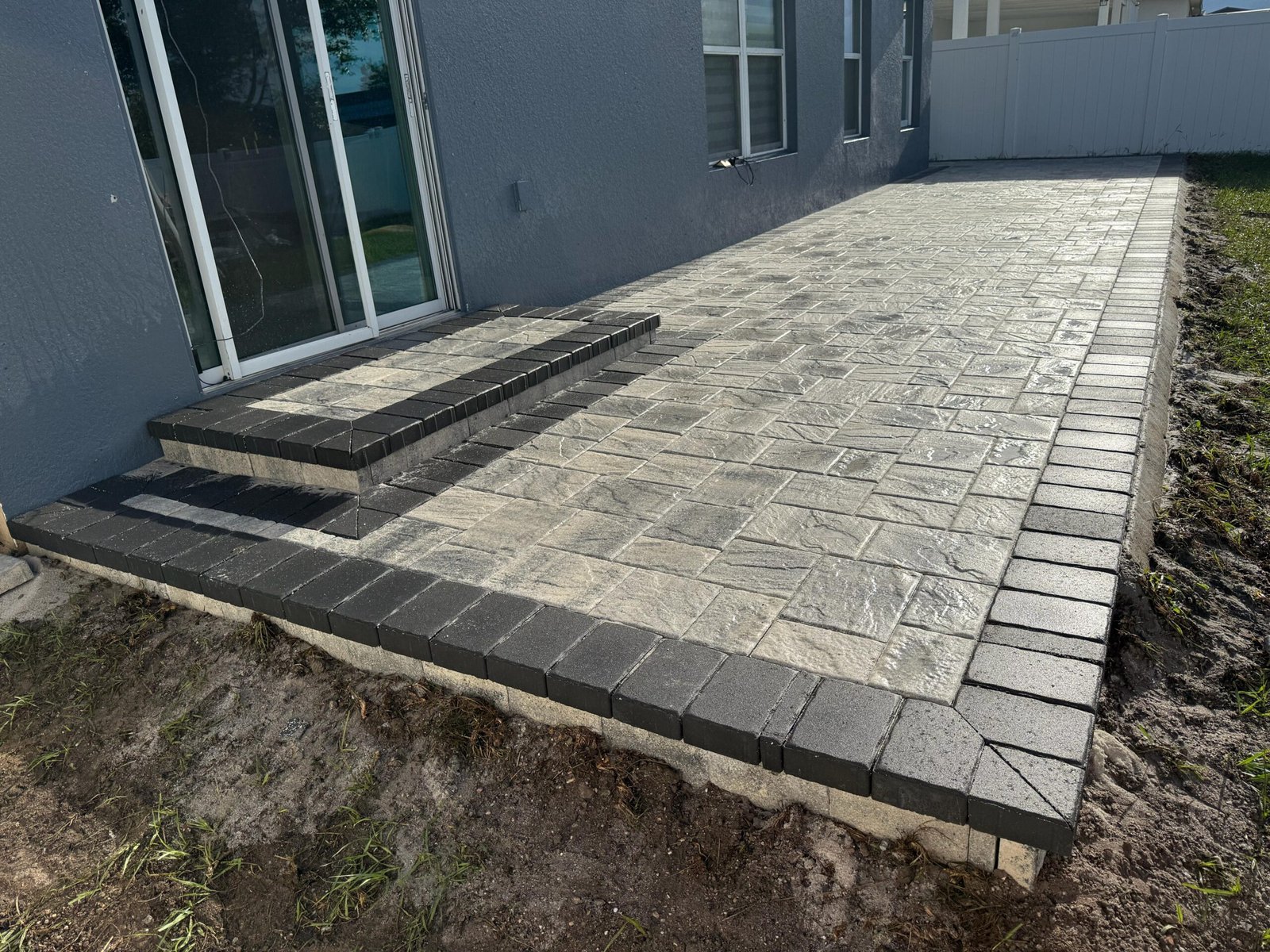 Professional concrete paver installation with clean borders and step detailing, creating a durable and elegant outdoor space.