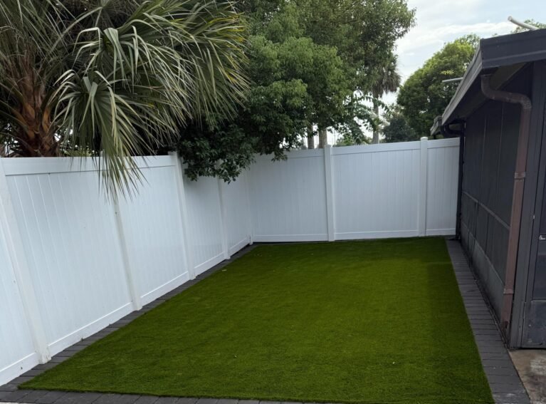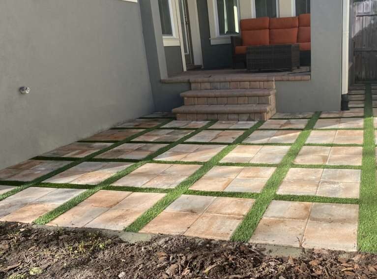 Low-maintenance artificial turf combined with paver borders for a clean, green, and modern backyard all year round.